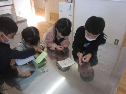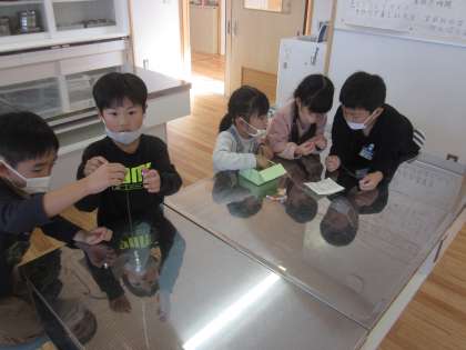 6年生に誘われ、太陽の光できれいに輝く飾り「サンキャッチャー」を作らせてもらいました。ビーズの順番や種類を考えながら製作しました。