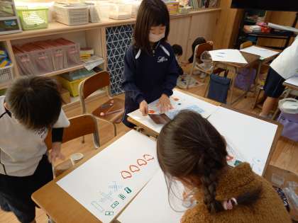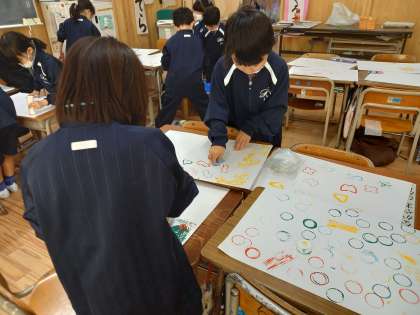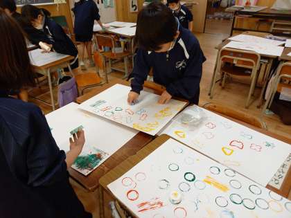 「どんな絵にしようかな」と工夫しながらスタンプを押している子どもたちです。