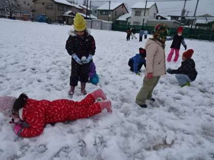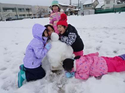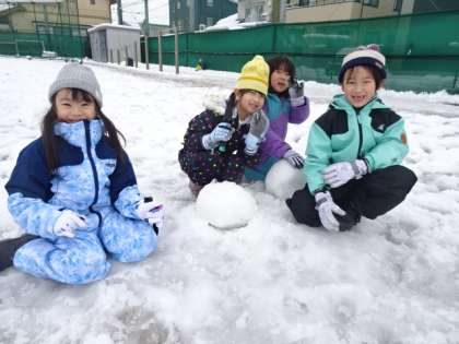 グラウンドで雪遊びをしました。学習に入るときに、雪で楽しく遊ぶためには、安全な場所を選んで遊ぶことや、仲間を傷つけないように、気遣うことなどの意見がでました。ファミリーの仲間と声を掛け合いながら、雪だるまを作ったり、追いかけっこをしたりと、楽しく活動することができました。