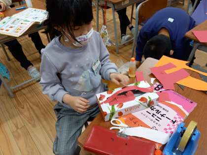 子どもたちは箱に色紙などを使って飾り付けをしています。
