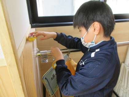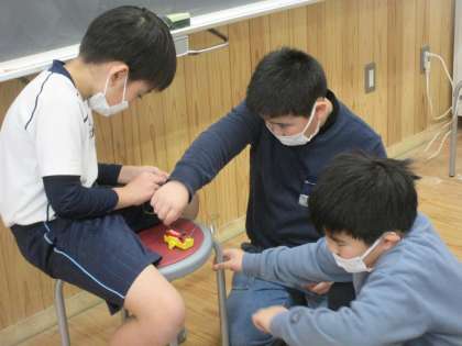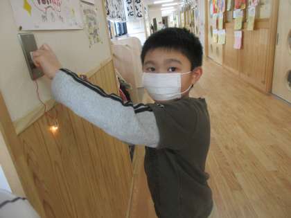 理科の学習では、豆電球と乾電池を使って明かりをつける学習を行っています。学校にある様々なものとつなげて、電気を通すものと電気を通さないものについて確かめました。実験の結果から、子どもたちは「鉄は電気を通しそうだよ」「銀色のものは明かりがついたよ」と自ら学びを進めていました。