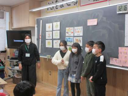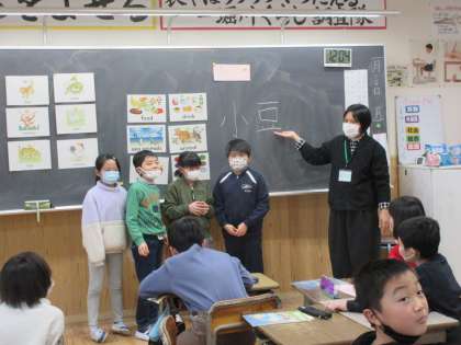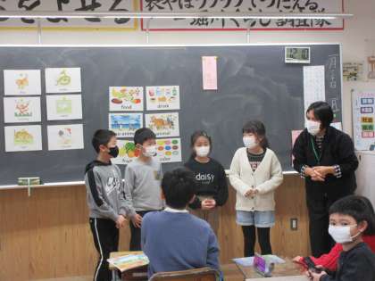 外国語の時間には、シルエットクイズやスリーヒントクイズ等、様々なクイズを行っています。今日は、漢字クイズをファミリーごとに考え、学級の仲間に出題しました。子どもたちは、どんな生き物や果物の名前か想像を膨らませながら楽しんでいました。