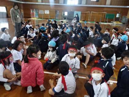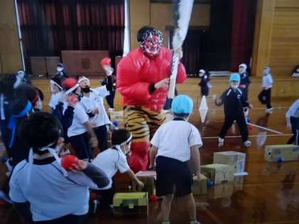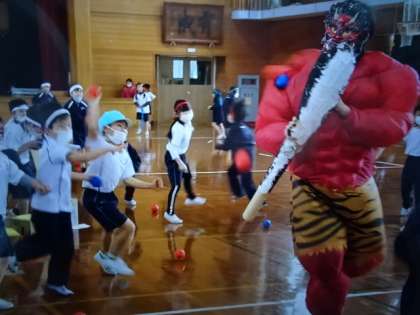 一年生では、「節分」に向けてそれぞれがたいじしたい鬼を考え、玉を段ボール目掛けて投げ合う「鬼退治ゲーム」をしました。ゲームを進めていると、突然、体育館に鬼がやってきて、大きな金棒を振り回しながら追いかけてきました。涙を流す子どももいましたが、鬼に立ち向かい、玉を投げながら追いかける勇敢な子どももたくさんいました。今日は給食に節分のまめが出ています。一人ひとりが心の中の鬼を見つめ、なりたい自分に向けて歩みだしています。