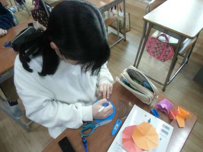 算数科の学習で、正多角形が、全ての辺の長さが同じで、全ての角の大きさが同じという特徴をもつ図形だと学習しました。折り紙とコンパスを使って、正八角形を作る方法が示してあり、試してみたところ、もっといろいろな図形も作ってみたいと、十六角形等の様々な正多角形を作って、その仕組みや特徴について考えました。