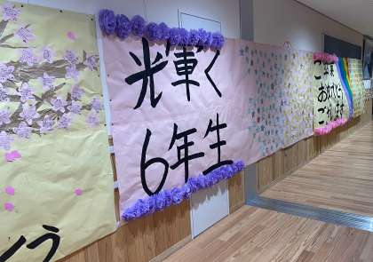 卒業を祝う環境を整えました(5年生) 公開日 2023/03/02 更新日 2023/03/02 5年生 どうしたら6年生が喜ぶ掲示になるのか考え、デザイン案を作成し、それぞれの掲示物を製作してきました。そして今日、6年生のまちや階段等の飾り付けを完成させることができました。来週の卒業を祝う週間に向けて、思いを込めて準備を進めています。