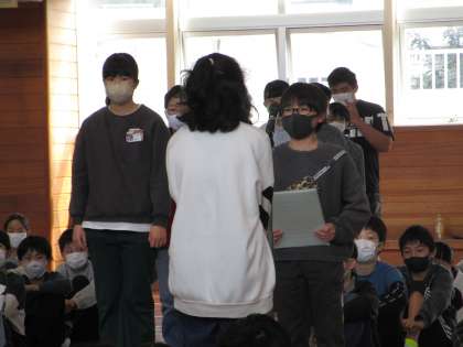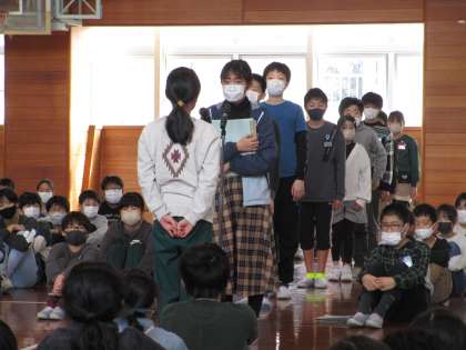 6年生と引き継ぎ式を行いました(5年生) 公開日 2023/03/02 更新日 2023/03/02 5年生 6年生から校旗や委員会の仕事を引き継いだ5年生は、最高学年に向かう期待と責任を感じながら式に臨み、さっそく委員会の活動を始動する姿が見られました。