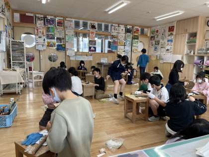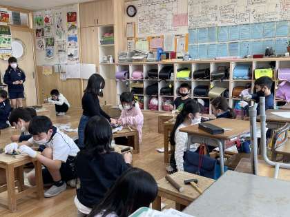 くぎを生かして丸太アート(3年生) 公開日 2023/03/03 更新日 2023/03/03 3年生 1学期に学習した図画工作科「くぎを生かして りゅう木アート」の経験を生かし、小さな丸太に釘を打っていろいろなものをつくりました。 釘を打ち込めるようになるまでの早さに経験の強さを感じました。作品は、動物や立体造形、鍵かけなどの日用品等、子どもたちのアイディアが光っていました。