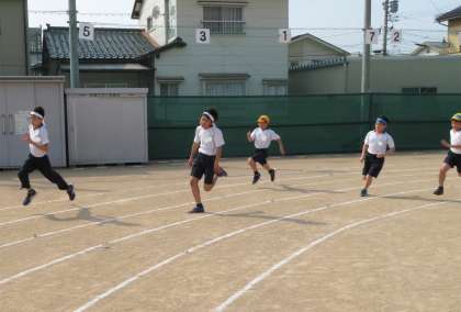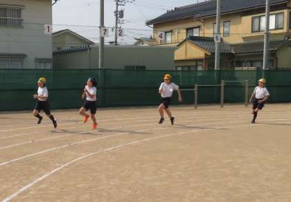 春を感じさせる温かさの中、6年生は小学校生活最後の100m走記録会を行いました。