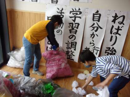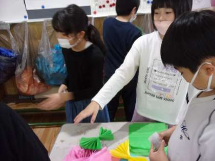 花紙でたくさんのお花飾りを作っているチームです。仕事を分けててきぱきと進めていました。