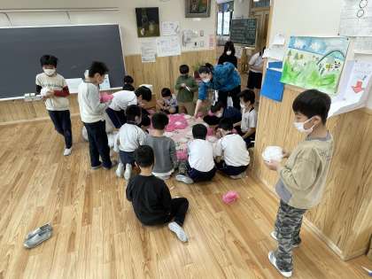 卒業、入学、おめでとうございます!その1(3年生) 公開日 2023/03/23 更新日 2023/03/23 3年生 卒業生さんへの感謝や、お祝い、入学する新1年生さんへお祝いの気持ちを込め、掲示物を3年生で作成しました。 4つの係に分かれて作業しました。 「桜」と「虹」をつくる係では、手を使って思い切り色を塗ったり、お花紙でつくったお花を丁寧に敷き詰めたりして、がんばる子どもたちの姿がありました。