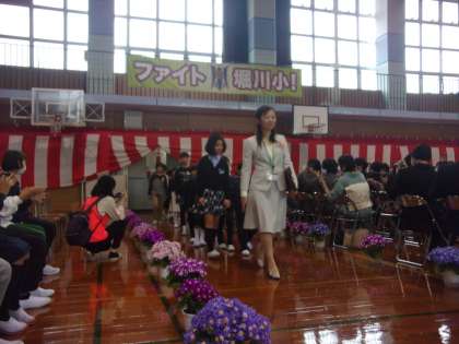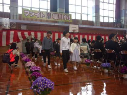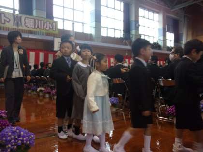 6年生の子どもたちが演奏する中、ワクワクとドキドキの気持ちが入り交じった表情の1年生の子どもたちが入場してきました。