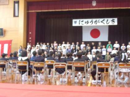 1年生の視線をあび、緊張しながら並ぶ子どもたちです。