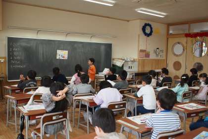 初めての図工の授業で、好きなものの絵を描きました。描いた絵を見せながら仲間に紹介しています。「いいねー!」と互いに言い合い、温かい気持ちになりました。