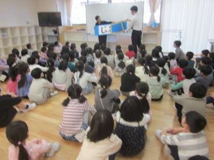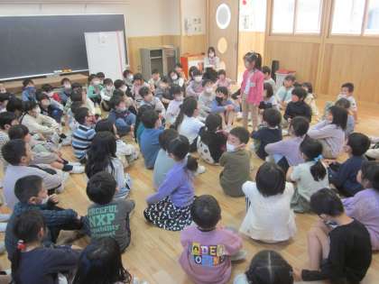 新しくできた低学年多目的室で学年集会をした2年生の子どもたち。