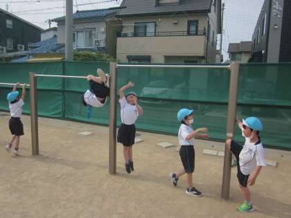 よい写真を撮りたくて栽培の庭で被写体を探すAさん。鉄棒が上手になりたいと願い、まめができるまで練習をしたBさん。飼育の庭に関心をもち、ガチョウのガガとピピの観察を始めたCさん。一人ひとりが伸ばす自分に向けて挑戦を始めました。