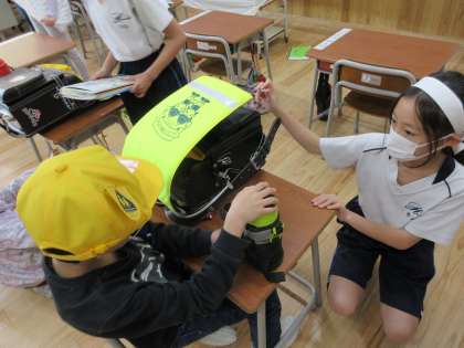 登校後、1年生も着替えて朝のトレーニングを始めています。「体操服はズボンの中に入れるよ」「一緒に走る人は行くよ〜!」と優しく声をかける5年生です。