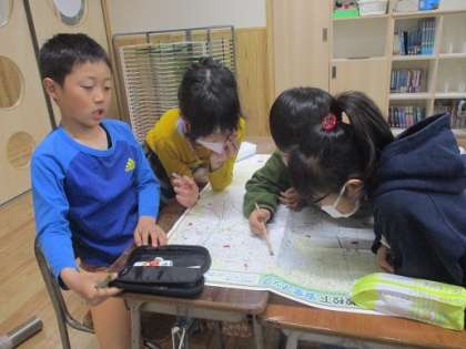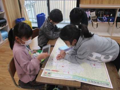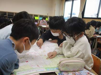 堀川校区には、病院や図書館等、たくさんの施設があることを地図で確認しました。3年生の社会科では、範囲を広げて「富山市のくらし」について学習をしていきます。