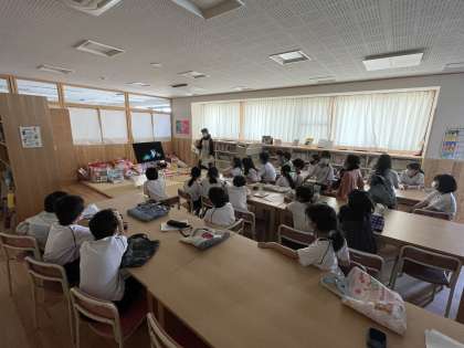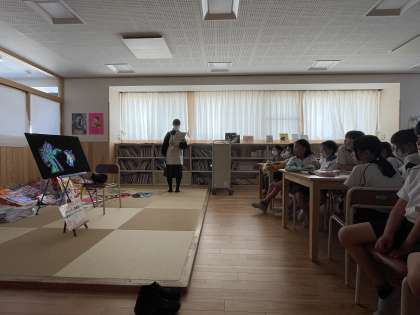 本をたくさん読もう(4年生) 公開日 2023/04/20 更新日 2023/04/20 4年生 今日は図書オリエンテーションを行いました。司書の高橋先生が、3年生から子どもたちが親しんでいる斎藤隆介さんの物語「花咲き山」を読み聞かせてくださいました。ブラックライトで照らされる登場人物に、「花咲き山」の雰囲気を感じたのか、子どもたちは集中して話を聞いていました。 図書室の使い方等もクイズ形式で楽しんで取り組めた子どもたちでした。これからも本をたくさん借りようと意気込む子どもたちでした。