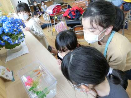 4組に新しく小赤の金魚1匹とウーパールーパー1匹が加わりました。生き物係の子どもたちが早速、名前を決めてくれました。お家でまた聞いてみてくださいね。
