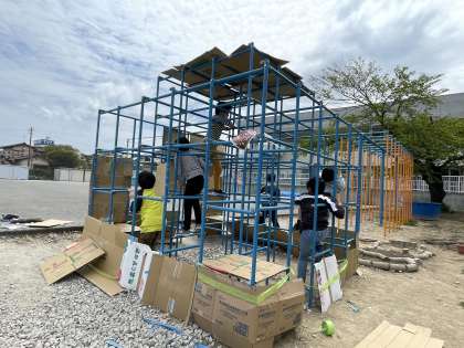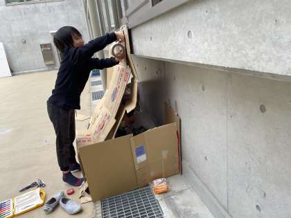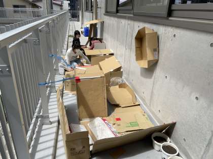 つくった小さな家の壁に絵を飾って居心地のよさを感じたり、元々ある場所の構造を上手く利用して屋根をつくったり、扉やカーテンを自分なりの工夫でつくり出したりするなど、それぞれが想像を膨らませながら、様々な技を生かして活動していました。