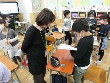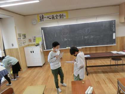 今日は自分の名前、好きな物、嫌いな物を英語で話し、仲間と交流しました。身振り・手振りを交えながら英語でのコミュニケーションを楽しみました。