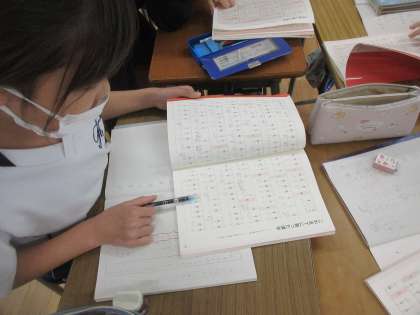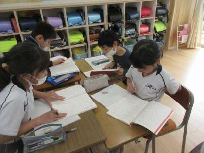 国語科の学習で、漢字の部首について学習しました。「しんにょう」や「うかんむり」等の部首をもつ漢字をファミリーごとに調べました。どのファミリーも真剣な表情で探していました。