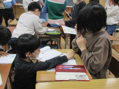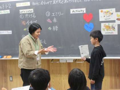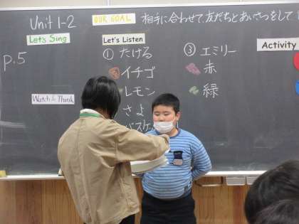 2回目の外国語活動では、仲間と自己紹介を行いました。自分の好きな食べ物やアニメ等、紹介したいことを考えて話したり、相手に尋ねたりするなど、楽しみながら取り組んでいました。子どもたちの姿からは、1年間の学習の成果を感じることができました。