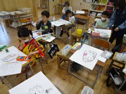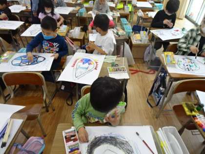 図画工作科「ひみつの卵がわれたら、ひみつの世界が・・・」の学習では、割り箸ペン使って自分のイメージに合う卵を描き、クレパスや水彩を使って、楽しく色付けをしています。自分の大好きな生き物や、スポーツなど、卵から生まれるものはどれもワクワクするようなものばかりで、子どもたちの想像力溢れる世界が広がりました。