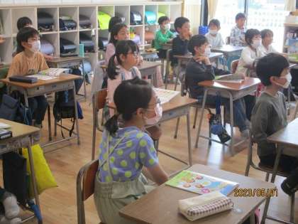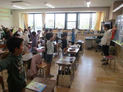 ALTの先生との学習が始まりました。身体を動かしながら、楽しんで外国語に親しんでいました。