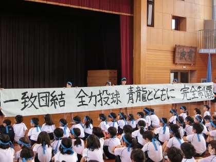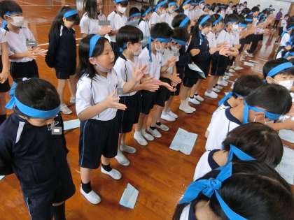 結団式がありました。三・三・七拍子や応援歌など大きな声で一生懸命練習していました。結団式の団長の言葉や団の仲間とのかけ声練習をしたことで、運動会に向けて気持ちを高めることができたようです。