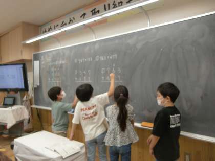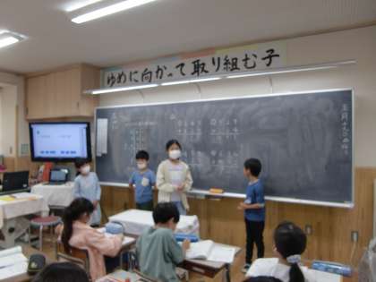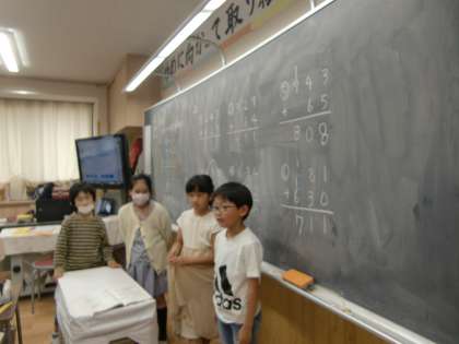 算数の学習にて(3年生) 公開日 2023/05/21 更新日 2023/05/21 3年生 「大きい数の筆算を考えよう」を学習しています。みんな、自分の考えを伝えたい気持ちでいっぱいです。だれもが前に出て伝えることができるように、ファミリー班ごとに前に出て黒板に答えを書いたり考えを伝えたりする機会を設定しています。