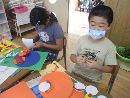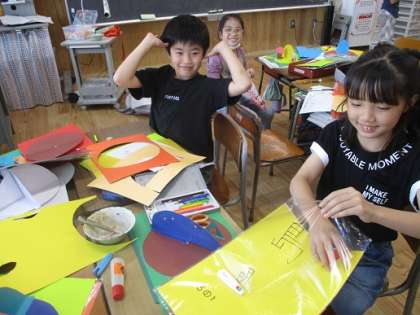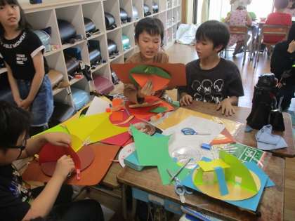 図画工作科「くるくるランド」 公開日 2023/06/01 更新日 2023/06/01 3年生 割りピンを使って材料を組み合わせました。くるくると回る動きを利用して、おもしろい世界を表現することができました。
