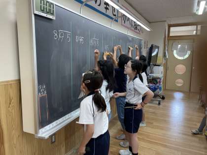 算数科「わり算の筆算」の学習では、わり算の筆算の仕方を覚えたり、意味を考えようとして取り組んでいます。今日はファミリーで筆算リレーをしました。話し合いながら筆算の行程を考えていた子どもたちでした。