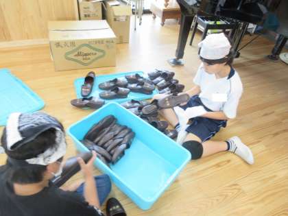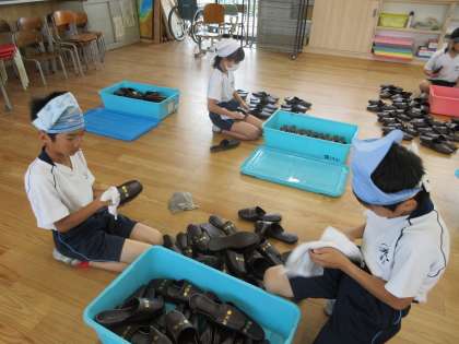 周りに気を配って(5年生) 公開日 2023/06/09 更新日 2023/06/09 5年生 先日の研究会では、たくさんの方々にお越しいただきました。休み明けに登校した子どもたちは、玄関に置かれた大量のスリッパを3階まで運び、一足一足丁寧に拭いていました。周りに気を配り、自分にできることに進んで取り組む5年生です。