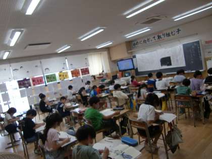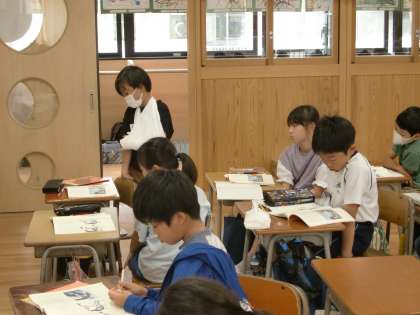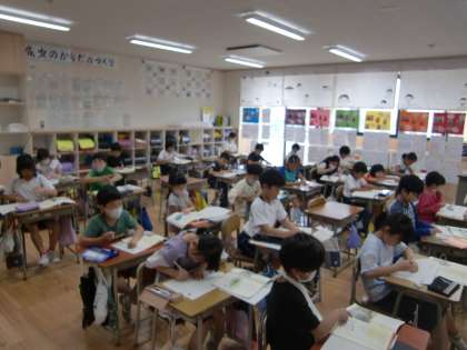 国語科の学習 (3年生) 公開日 2023/06/09 更新日 2023/06/09 3年生 「鳥になったきょうりゅう」のお話を読みました。初めて知っておどろいたことや感動したことなど自分の考えをワークシートにまとめてみんなで、話し合いをしました。