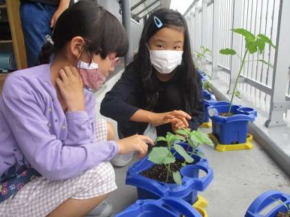 葉の枚数が増えていることに驚いていました。植物の成長に心を寄せている子どもたちです。