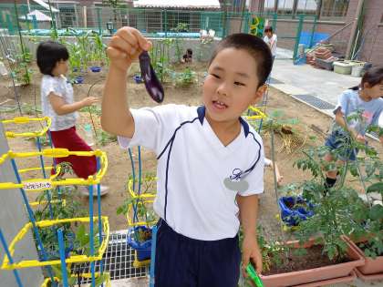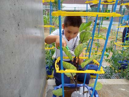育てている野菜が、続々と実をつけ、収穫を楽しみにしている子どもたちです。