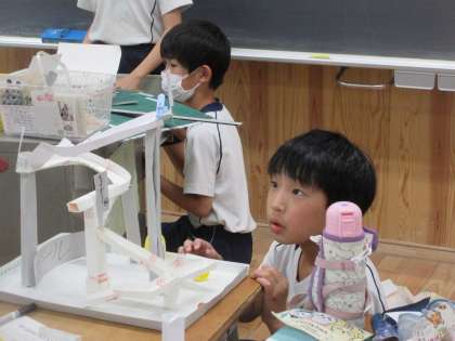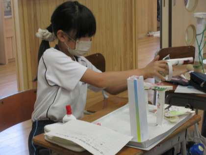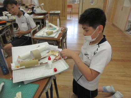 図画工作科の学習では、厚紙や画用紙を使ってコース作りを行なっています。真っ直ぐな道だけでなく、カーブや坂道等、それぞれに工夫を凝らして作品を作っています。納得のいくコースになるように試行錯誤する表情はどの子も真剣です。