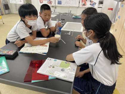 理科の学習では、人間の唾液がでんぷんを変化させるかどうかを確かめました。子どもたちは、自分の予想と結果を照らし合わせ、でんぷんは唾液によって一体何に変化したのかなど、新たに調べたいことを見付けた様子でした。