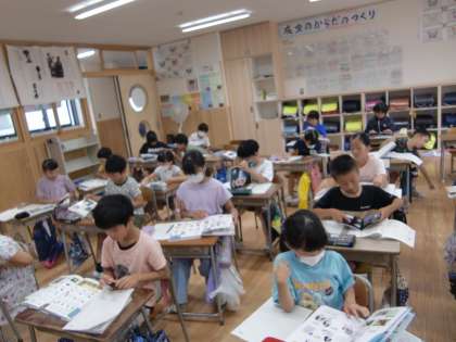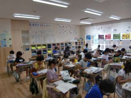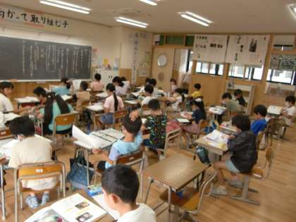 引用するときに気を付けなくてはいけないことを学びました。 その後それぞれ、選んだ図鑑や科学読み物を読んで、楽しいと思ったことやおどろいたことなどを引用し、ワークシートに書き込みました。みんな、熱心に取り組んでいました。