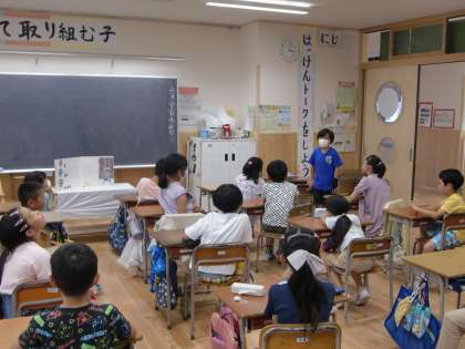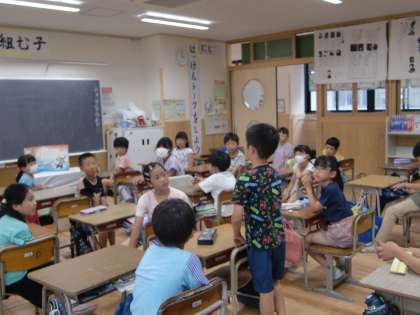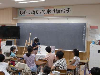 大型絵本の読み聞かせ会(3年生) 公開日 2023/06/26 更新日 2023/06/26 3年生 下校前「ももたろう」の大型絵本の読み聞かせをききました。みんな、本がなくてもお話しできるお馴染みの昔話です。大きなももが流れてくる表現のちがいや少し異なる幸せな結びに心をわくわくさせながらお話を聞き、振り返りではそれぞれが心に残ったことを伝え合うことができました。
