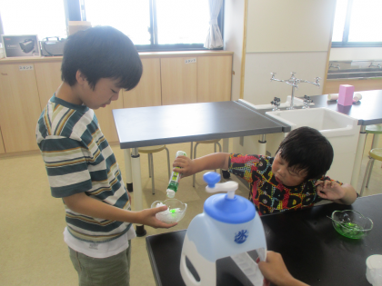 友達とかき氷機で氷を削ったり、削った氷にシロップをかけたりしました。かき氷を口に入れると、「美味しい!」や「おかわり!」、「ブルーハワイの味のかき氷も食べたいな」という声が上がりました。次回が楽しみです。