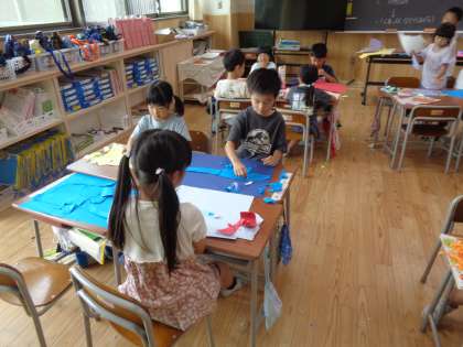 やぶいたかたちからうまれたよ(1年生) 公開日 2023/07/11 更新日 2023/07/11 1年生 図画工作科「やぶいたかたちからうまれたよ」の学習では、色画用紙を破り、破れた形から見立てて、作品作りを行いました。 子どもたちは、画用紙の向きを変えたりひっくり返したり、組み合わせを考えたりしながら表していました。