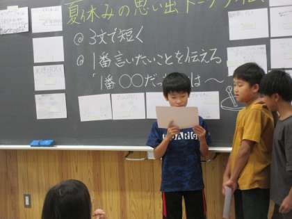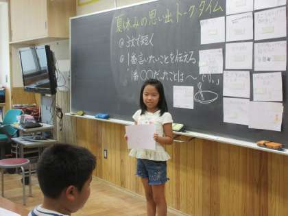 登校日では、久しぶりに元気いっぱいの子どもたちの声が響きました。学級活動では、夏休みの思い出やできるようになったこと等を紹介し合いました。くらしの時間では「残りの1週間は早めに宿題を終わらせるようにしたいな」「まだまだ遊び足りないから思いっきり楽しみたいな」「2学期に向けて運動をしたいな」「家族との時間を楽しみたいな」など、一人ひとりの目当てを確かめながら仲間の話を聞いていました。また、始業式で会えるのが楽しみになった時間でした。