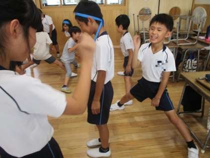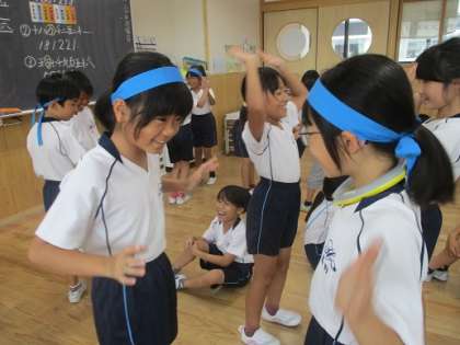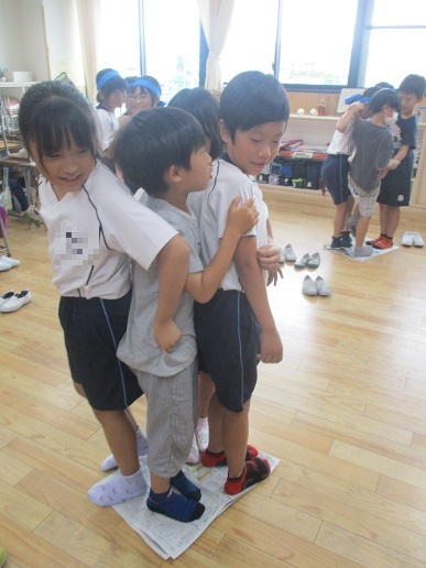 「じゃんけん股割り」「新聞じゃんけん」「手押し相撲」等、室内でできる運動に取り組みました。