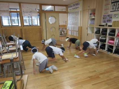 朝活動で教室掃除をしている子どもたちです。教室をよりきれいにするためには、隙間なくぞうきんがけをする必要があると考えた子どもが、一列になってぞうきんがけをすることを提案しました。よりよい活動になるよう、工夫しながら取り組む子どもたちです。