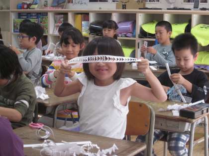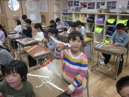 図画工作科の学習で三角形の画用紙の立体の中にどんなArtをつめこむか考えた子どもたち。