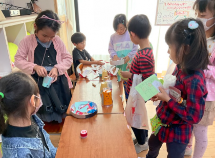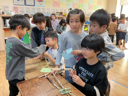 生活科「ゴムで動くおもちゃ」の学習で、ゴムを使ったおもちゃを1年生に紹介したいと、おもちゃランドを作って、1年1組の皆さんを招待しました。季節を感じる工夫をして、1年生を楽しませたいと、ハロウィンの飾りを作ったり、びっくりコーナーを作ったりしながら、交流活動を楽しみました。最後には、来週の集会で歌う「みつけよう大切なもの」を合同で歌いました。互いの心がつながり合う喜びを感じるひと時でした。