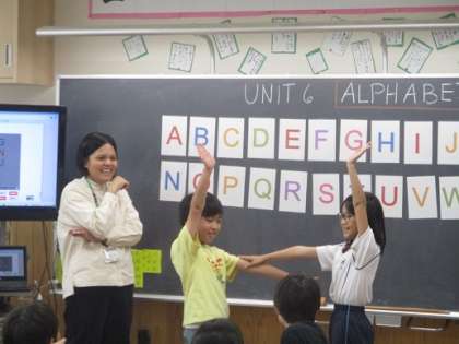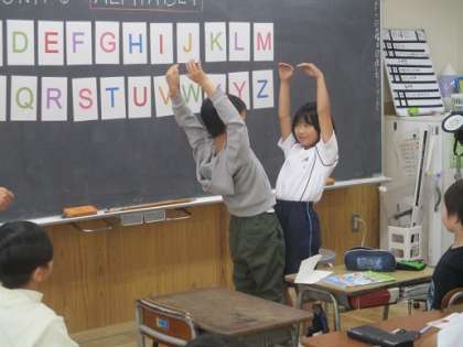 アルファベットの学習が始まりました。写真は、身体を使ってアルファベットの文字を表しているところです。