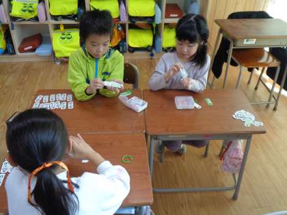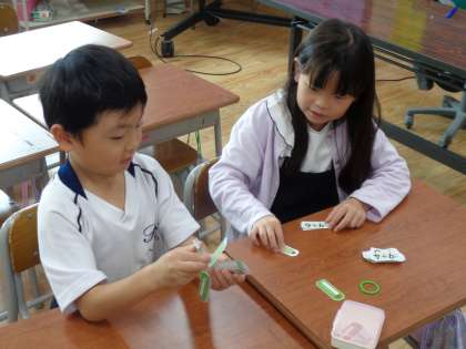 計算カードを使って(1年生) 公開日 2023/11/06 更新日 2023/11/06 1年生 算数科「たしざん」の学習では、繰り上がりの足し算を学習しています。より早く計算できるように「計算カード」を使っています。仲間と一緒に練習もします。